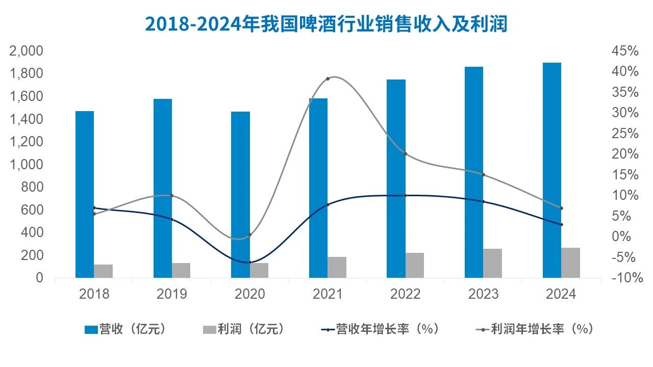 啤酒行业营收与利润同样存在波动。2024 年规模以上啤酒企业销售收入约 1900 亿元,同比增长 3%;实现利润总额 270 亿元,同比增长 7%,呈现 “量稳价升” 的良性发展态势。