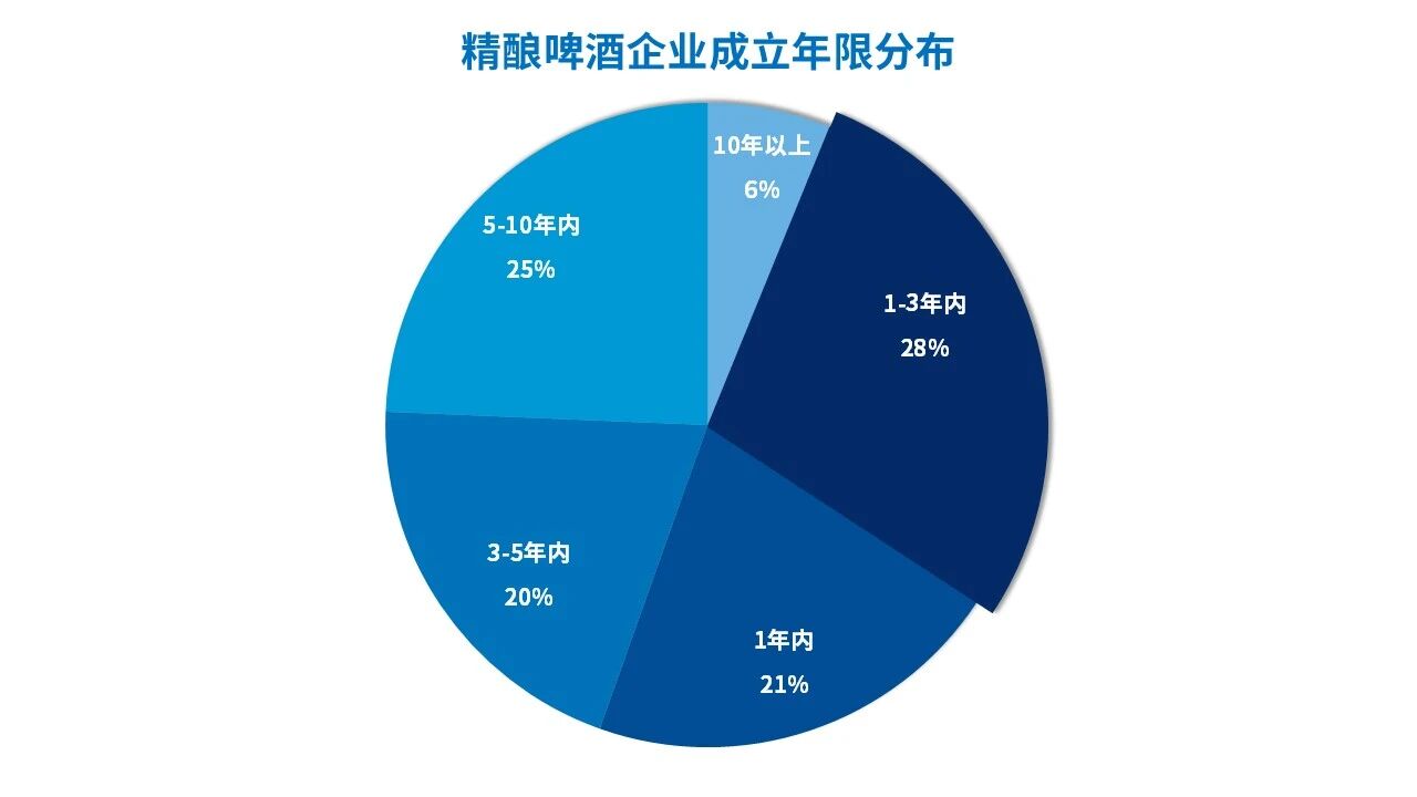 在产品赛道领域,精酿啤酒开始快速崛起,企业数量大幅增长。据线下零售监测机构马上赢数据显示,2024年Q1到2025年Q1期间,在售精酿商品的数量增长65.60%,新品数量则增长154.74%。此外,根据天眼查统计数据(截至2025年8月6日),含有 “精酿啤酒” 业务且注册资金在1亿元内的企业数量已超3985家,近50%的企业成立于3年内。