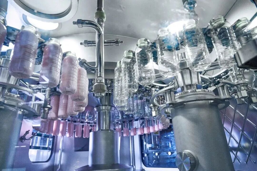对于所有这些流程,除了灵活性和效率,质量也是关注焦点。该生产线同时配备了四套Checkmat检测系统,分别用于瓶坯、瓶盖和套标检测。对于乳品,卫生性能尤为关键。瓶坯采用气态过氧化氢(H₂O₂)进行杀菌,瓶子始终处于无菌环境,直到完成封盖。此外,还可以在不破坏无菌环境的前提下进行空瓶剔除或取样操作,无需中断生产流程。