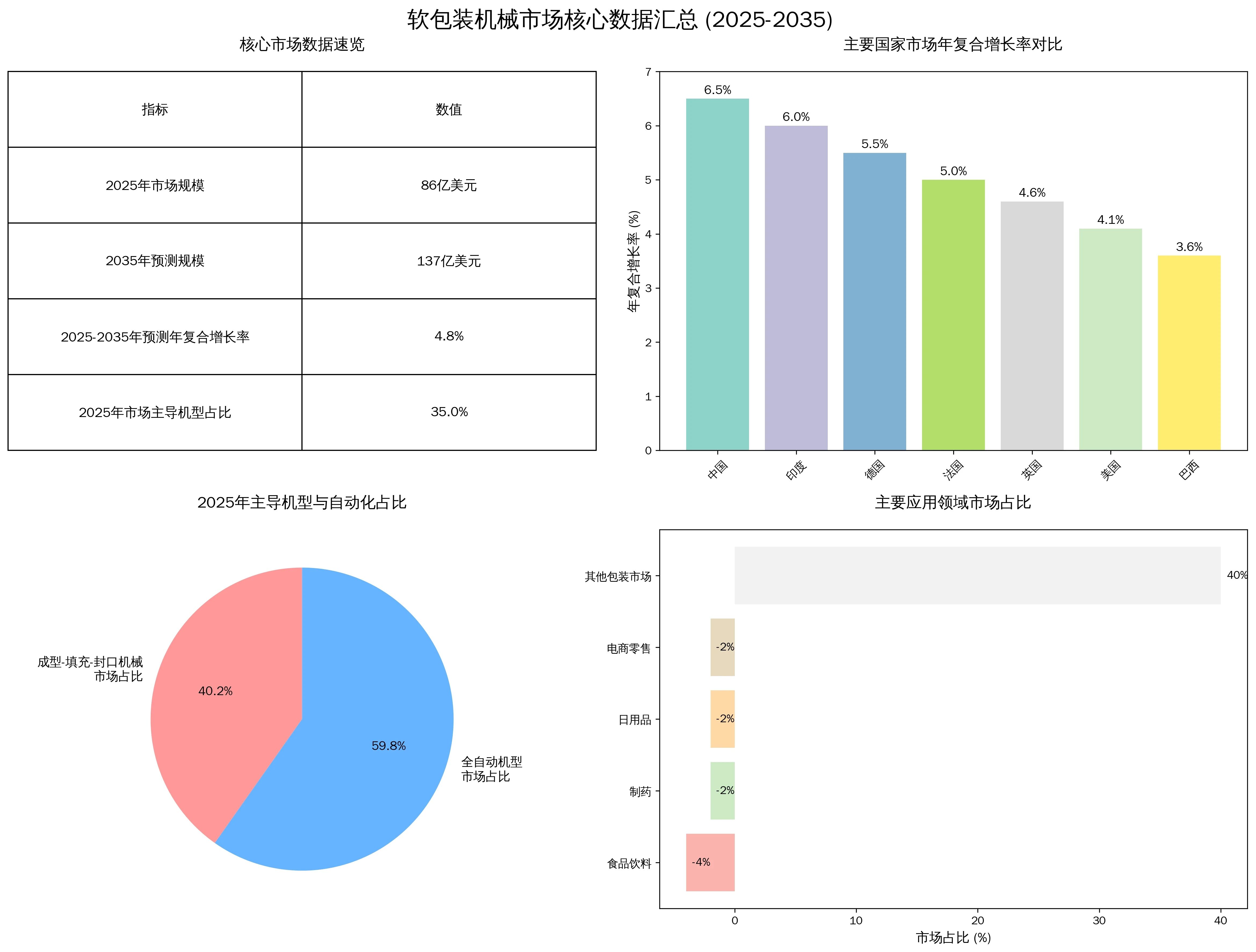 摘要:全球软包装机械市场规模预计将从2025年的86亿美元增长至2035年的137亿美元,年复合增长率达 4.8%。