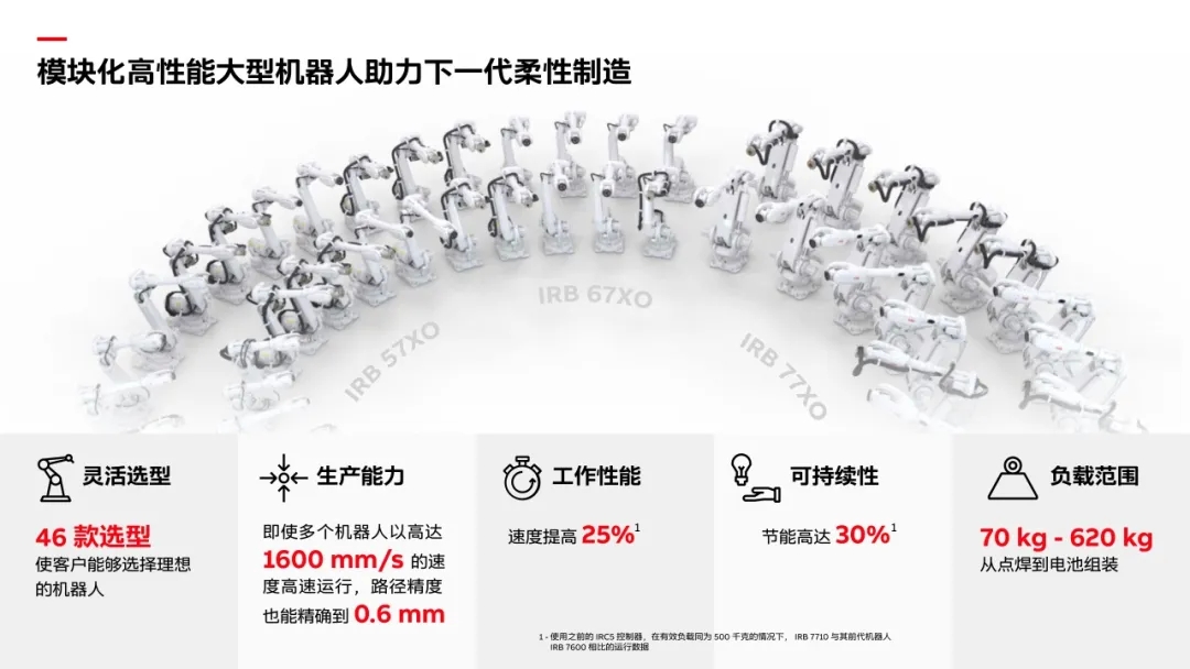 随着企业为了提升生产力、达成可持续发展目标而引入新技术和新设备,我们设计出了模块化大型机器人系列产品,提供客户更合适的机器人选型,帮助他们高效地开展业务。凭借市场上最全面的产品组合:机电一体化平台、工业机器人、协作机器人和自主移动机器人(AMR),全新的大型机器人系列产品进一步扩充了我们的产品线,协助客户解决劳动力短缺问题,同时助力客户在可持续经营模式下保持市场竞争力。