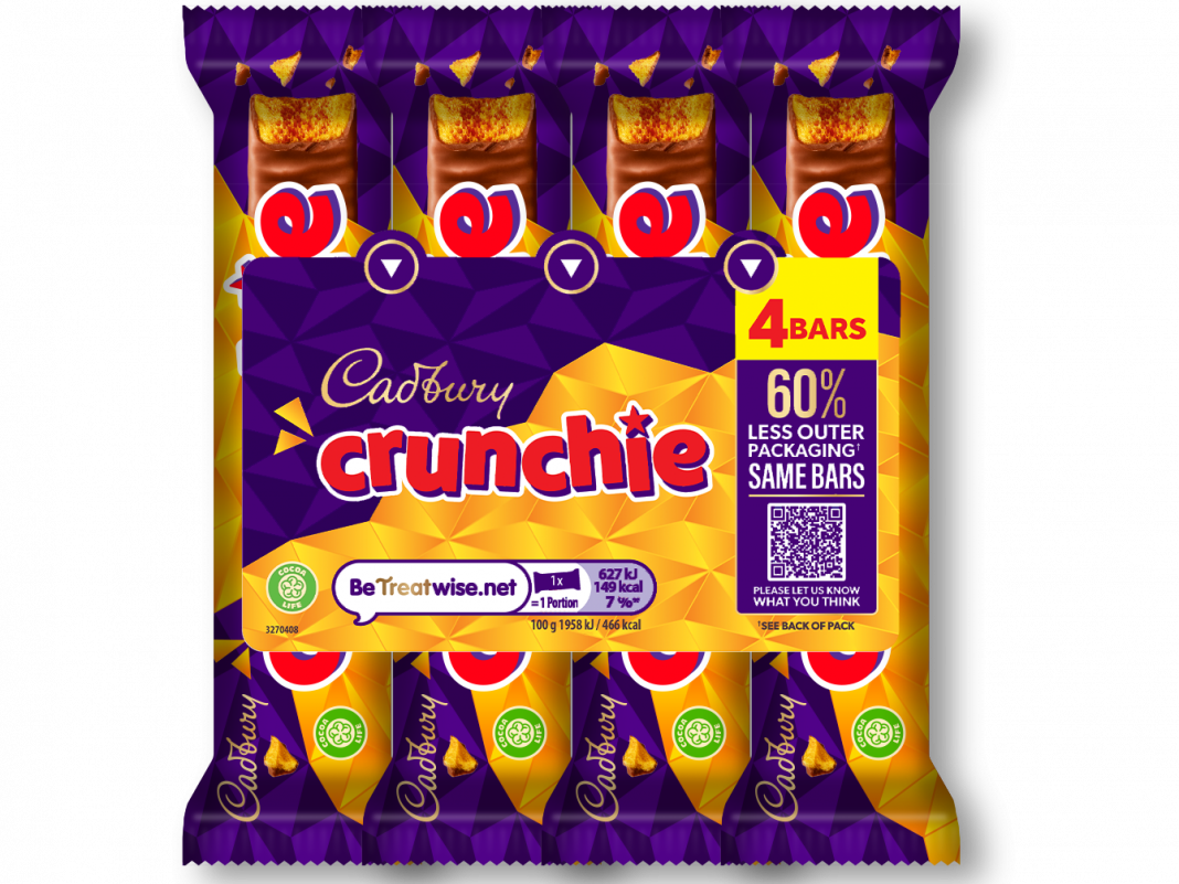 亿滋国际(Mondelez International)旗下的英国糖果品牌吉百利(Cadbury),正于英国乐购(Tesco)门店为其脆心巧克力(Crunchie)多包装产品试点新包装。该公司表示,在一项将持续至 2026 年初的 “测试与学习” 计划中,门店销售的约 180 万份 “吉百利脆心四支装多包装” 产品的塑料外包装,将被贴纸替代,此举能使每份产品的外部塑料包装减少 60%。
