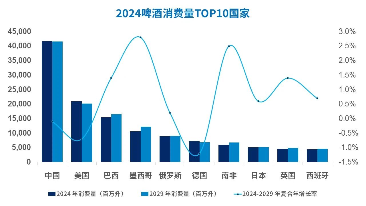 近年来,全球啤酒消费格局呈现 “总量稳定、区域分化” 特征——2019-2024年消费量约下降0.05%。全球啤酒消费量 TOP10 国家中,中国位居首位,约占全球总量21%。未来五年,全球啤酒消费量年复合增长率可能仅有1.2%,继续维持 “存量竞争” 态势。