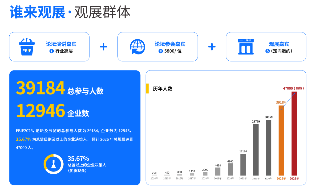 上届FBIF2025论坛与展览的观众总人数达到39184人,其中35.67%的参会观展嘉宾为总监以上的企业决策人。展馆毗邻FBIF论坛现场,论坛巡展时间段,行业中高层也将齐聚展区交流。(FBIF2025展览观众名录
